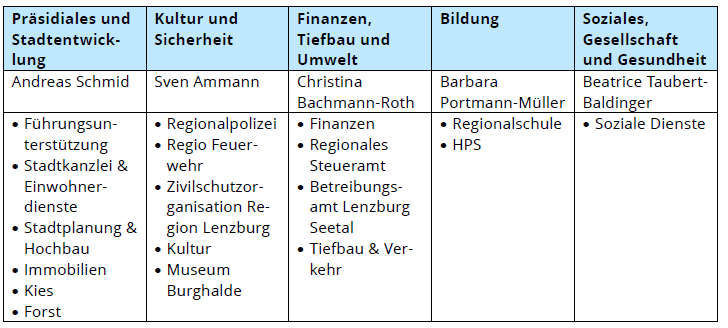 Der Stadtrat hat in seiner ersten Sitzung der ab 1. Januar 2026 gültigen Zusammensetzung die Bildung und Verteilung der Ressorts für die Amtszeit 2026 - 2029 festgelegt. Der Stadtrat ist überzeugt, dass die beschlossene Zuteilung eine solide Grundlage für eine konstruktive und erfolgreiche Zusammenarbeit im Stadtratskollegium in den kommenden vier Jahren bildet und es ermöglicht, die bevorstehenden Aufgaben und Herausforderungen zielgerichtet anzugehen.